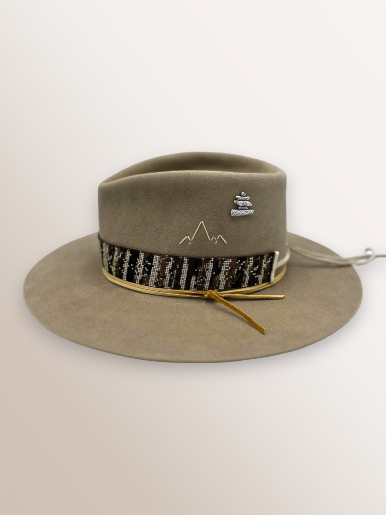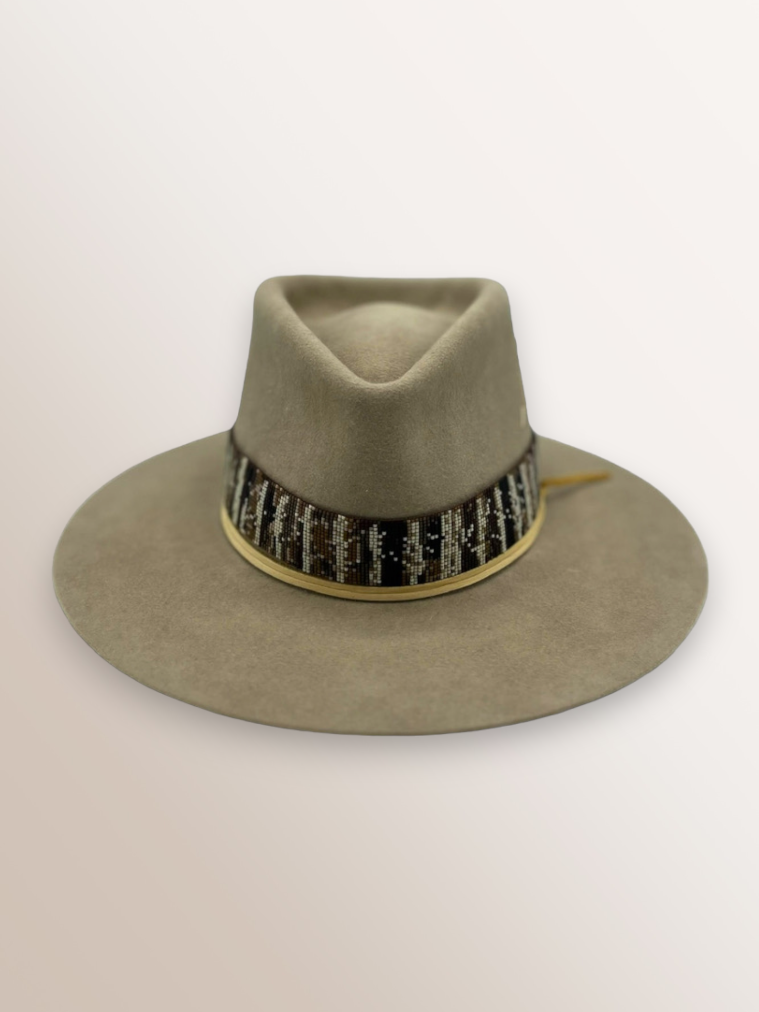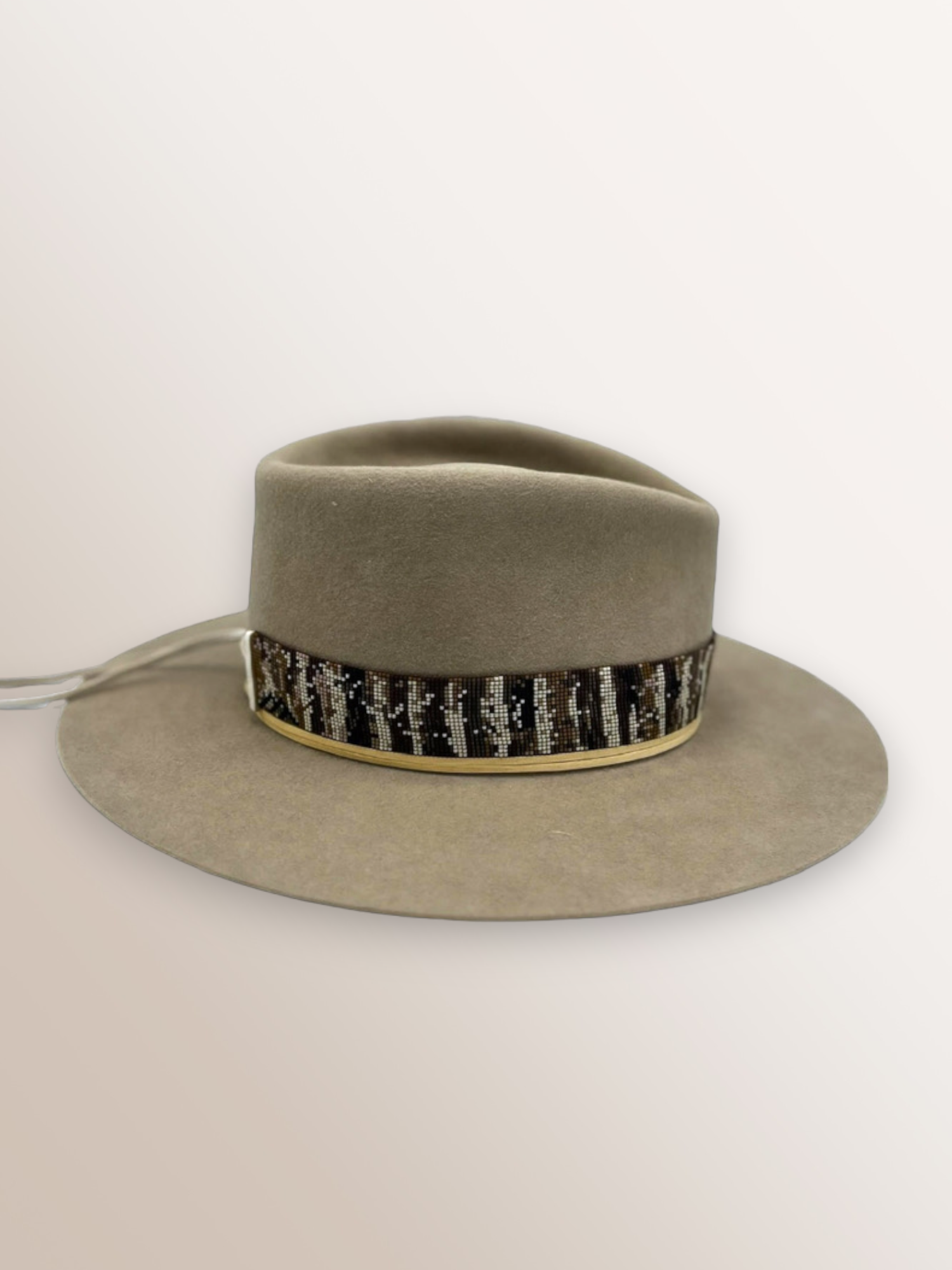 The band is hand-loomed with glass beads, tied with elk leather and is 19 inches long.