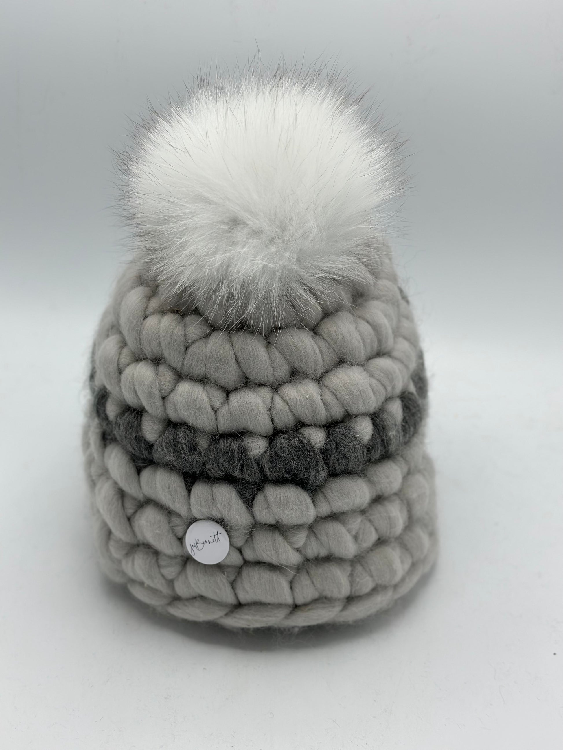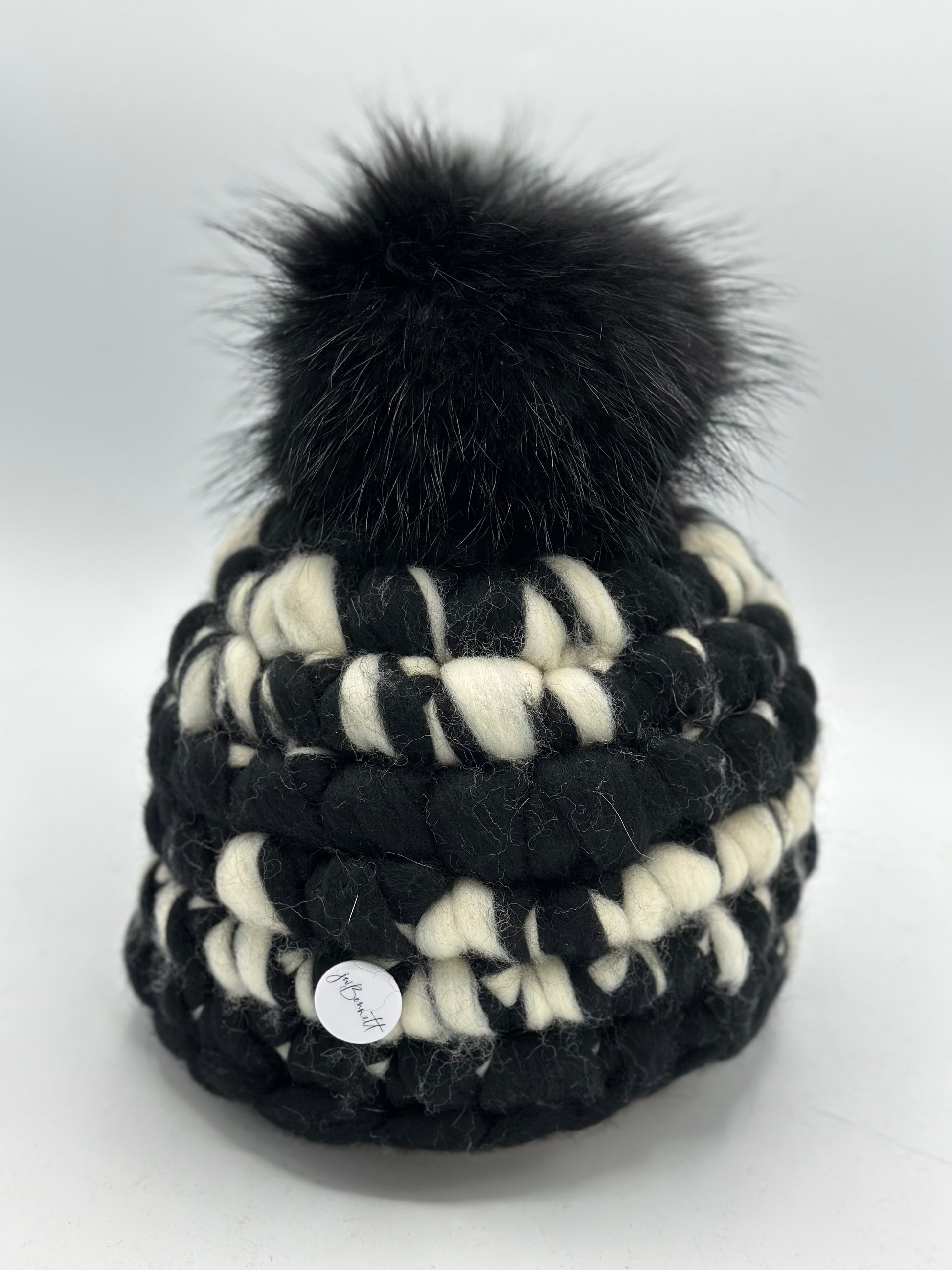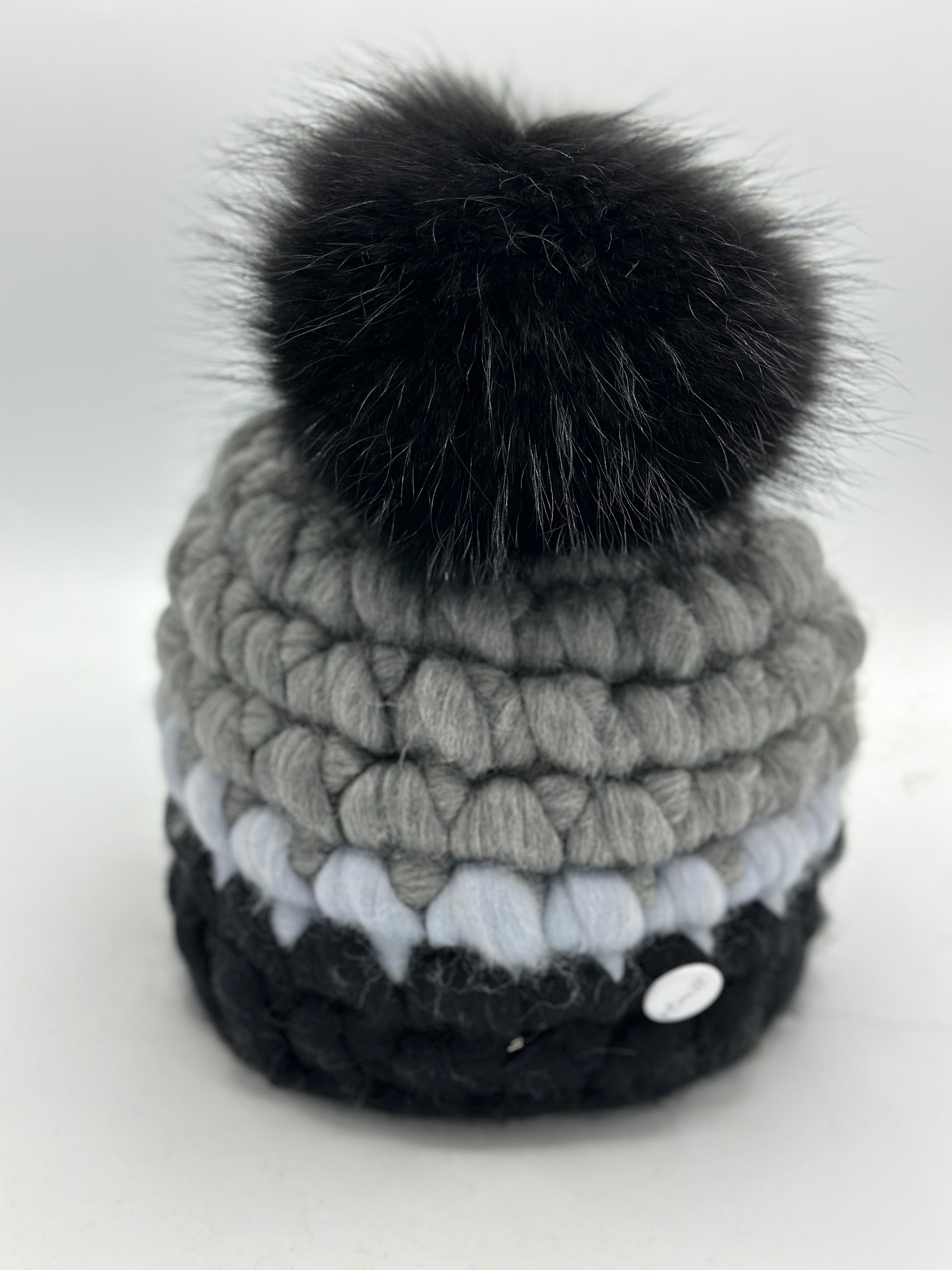 100% wool. One Size Fits most. Wool will stretch and shape to your head.