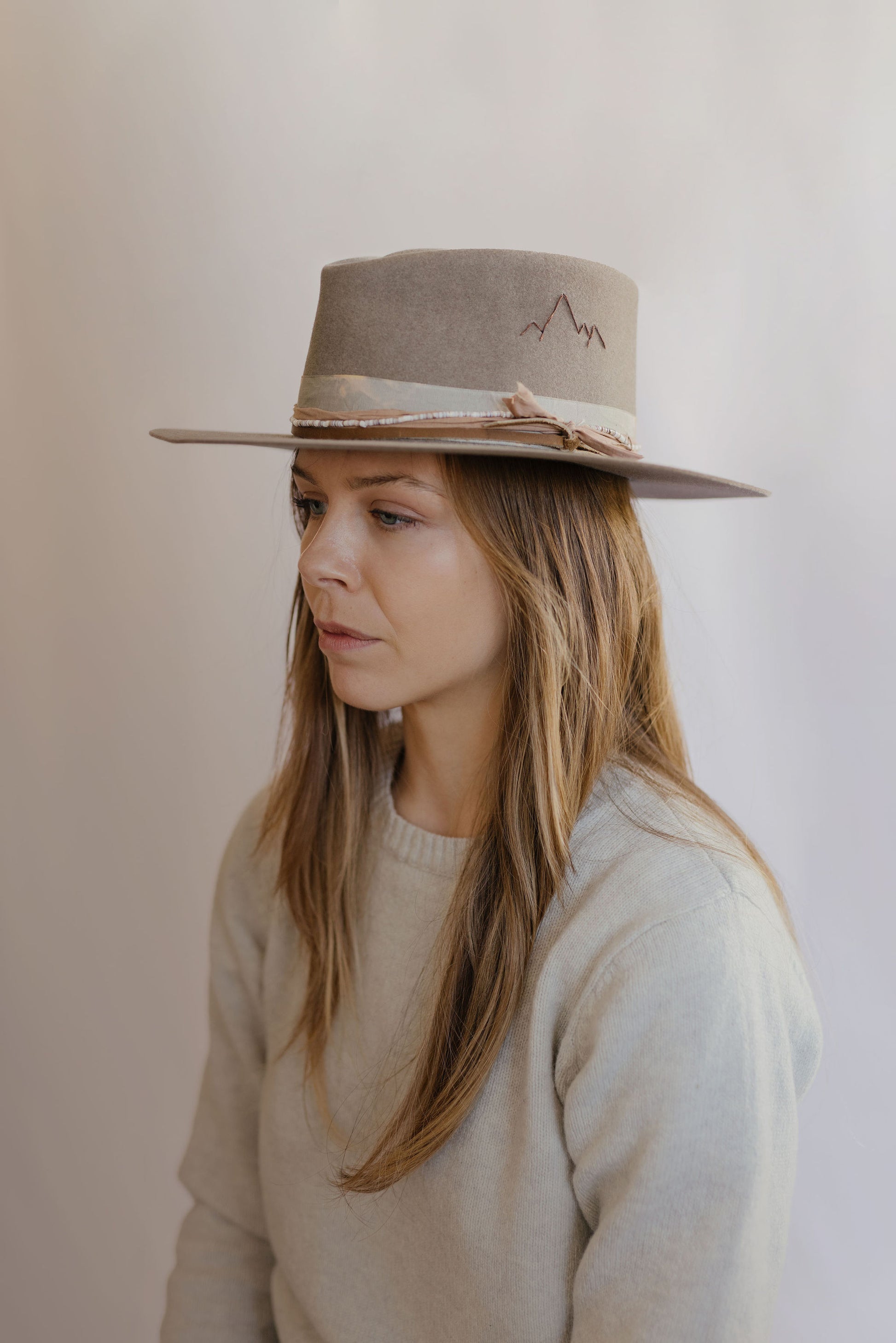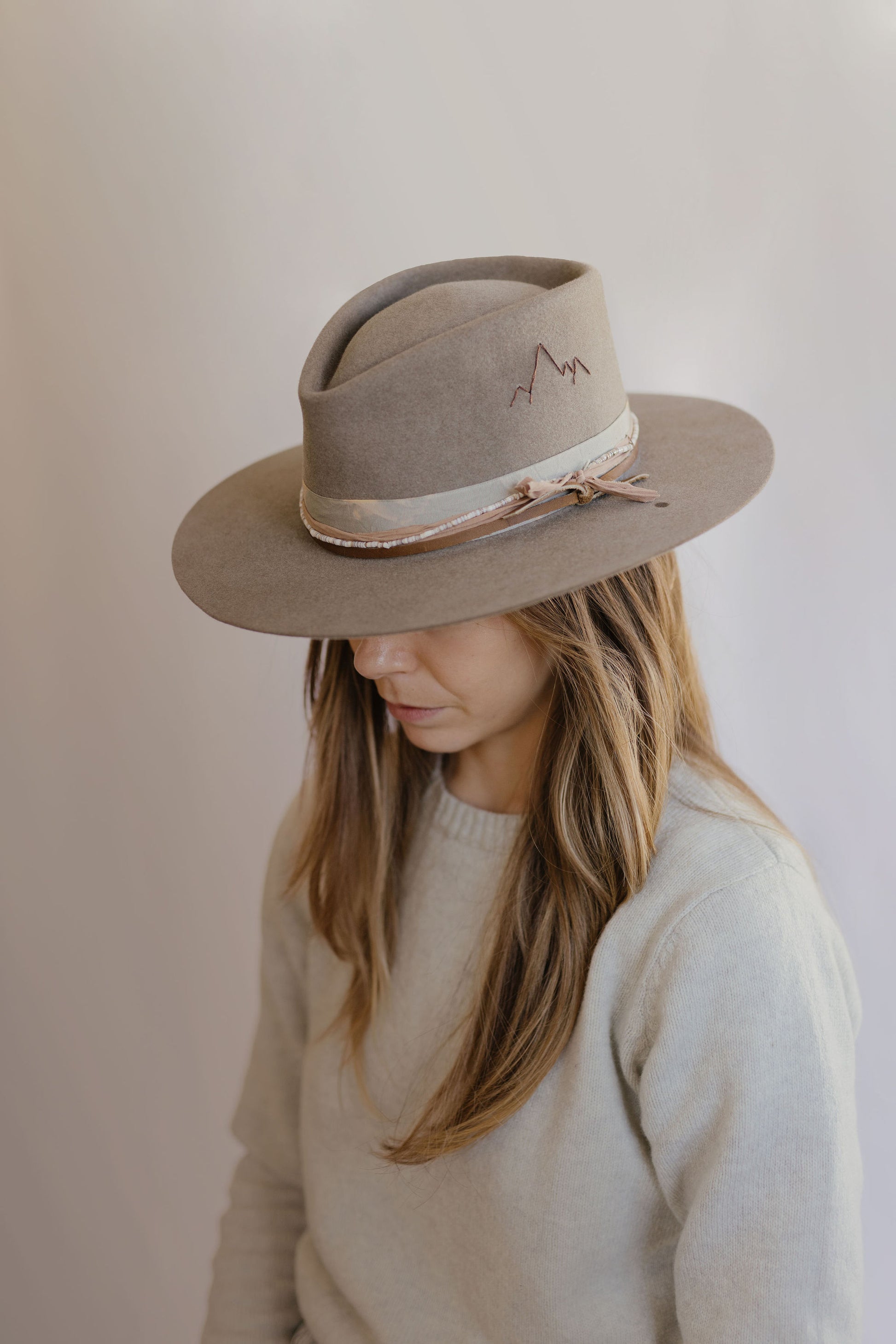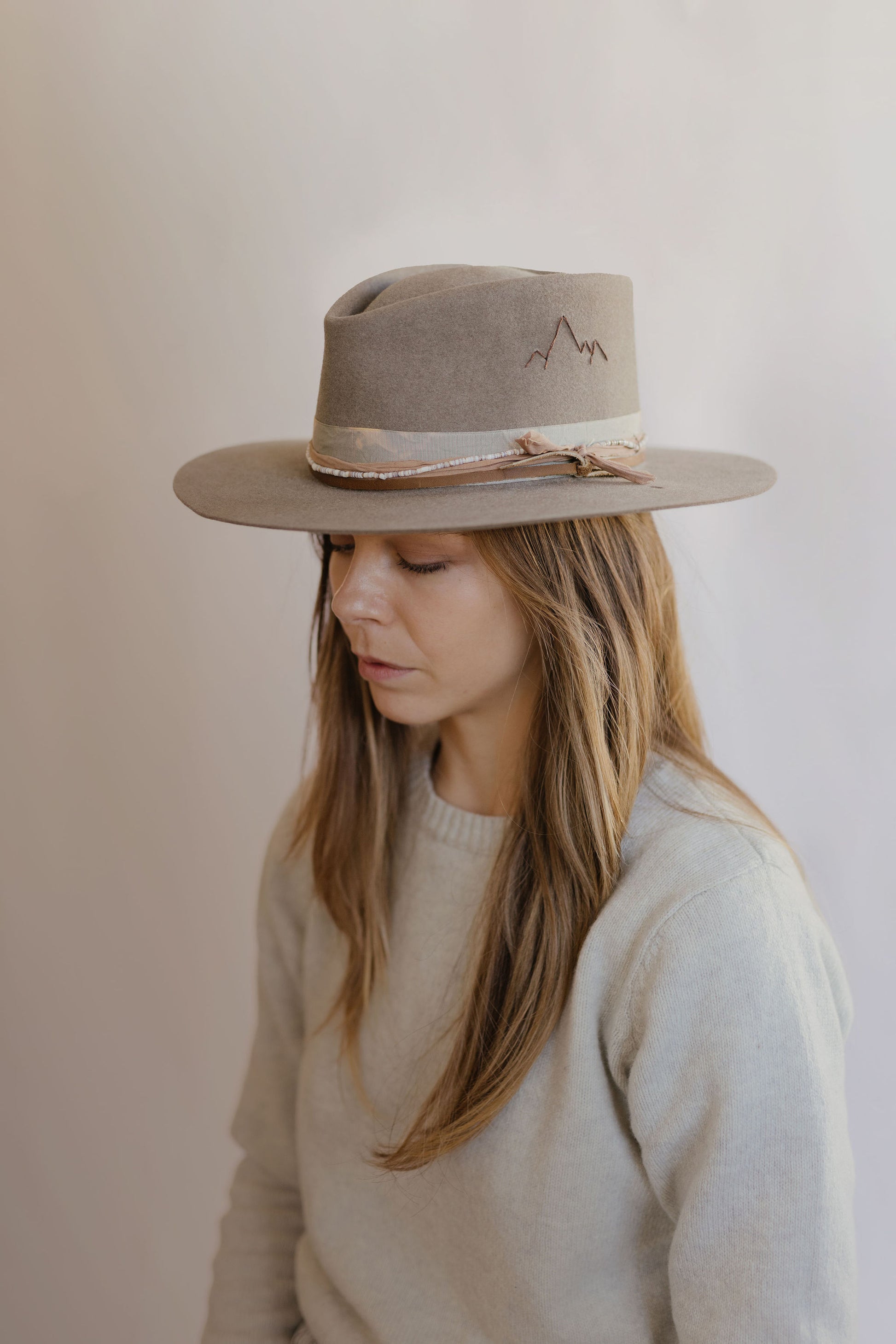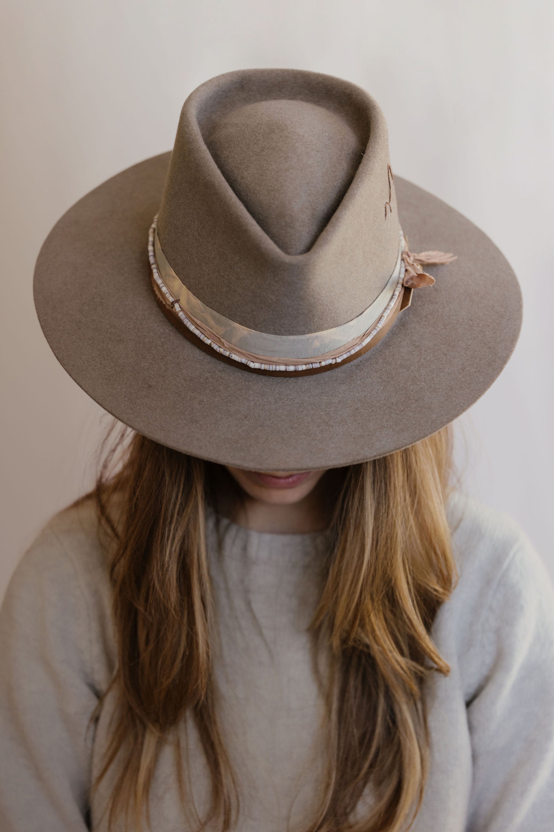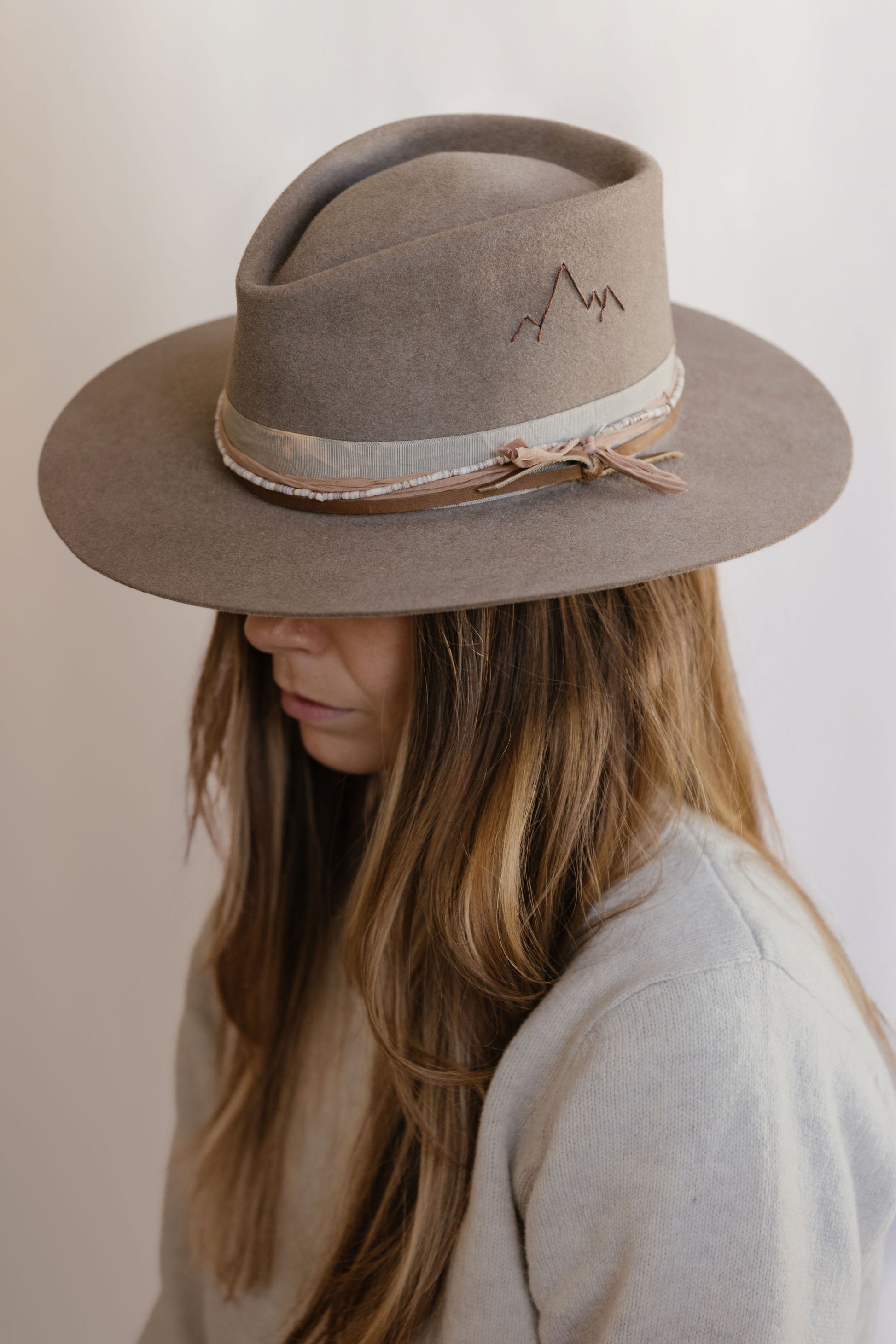 Leather, beads, vintage ribbon, and fabric band details.