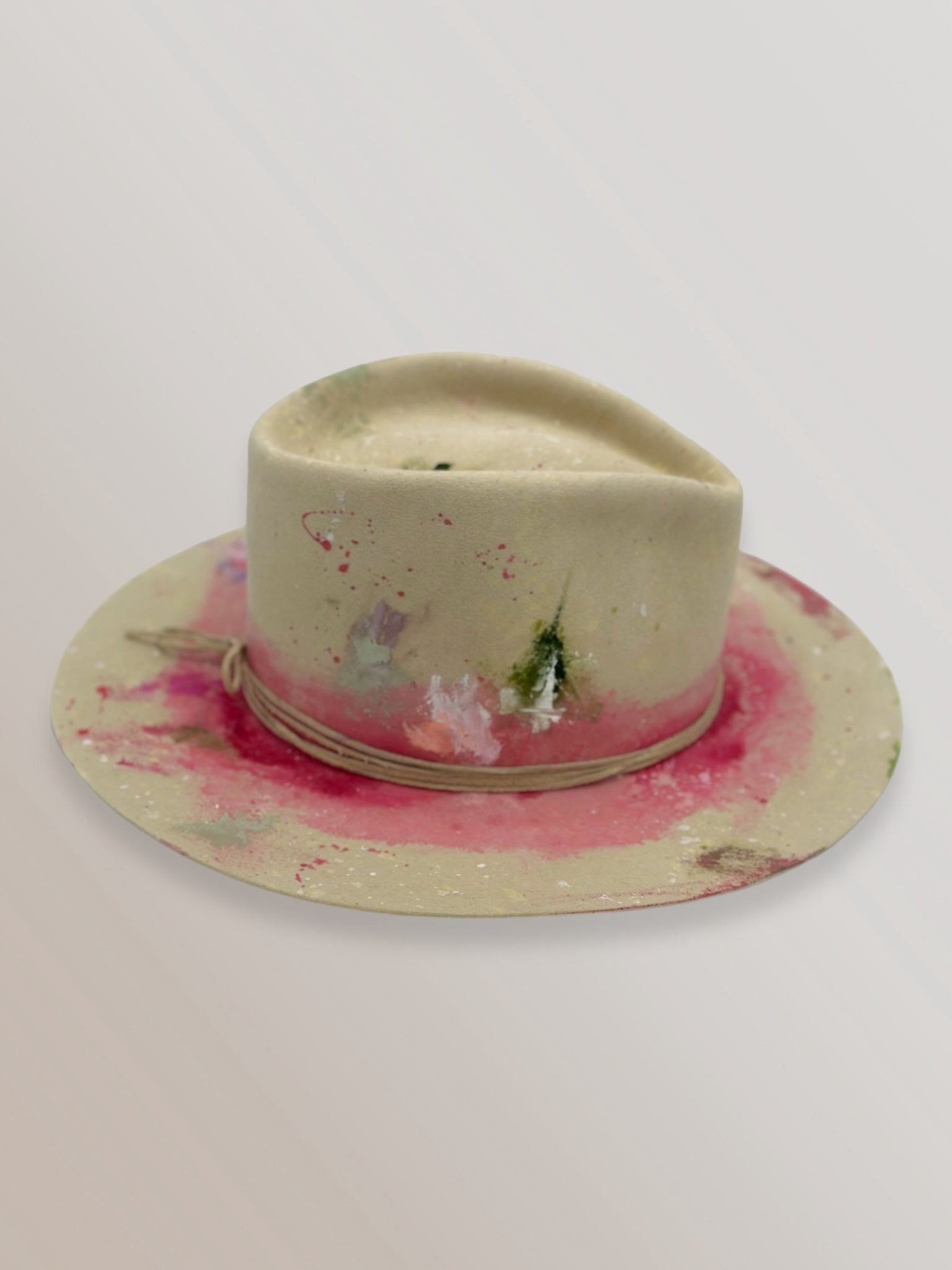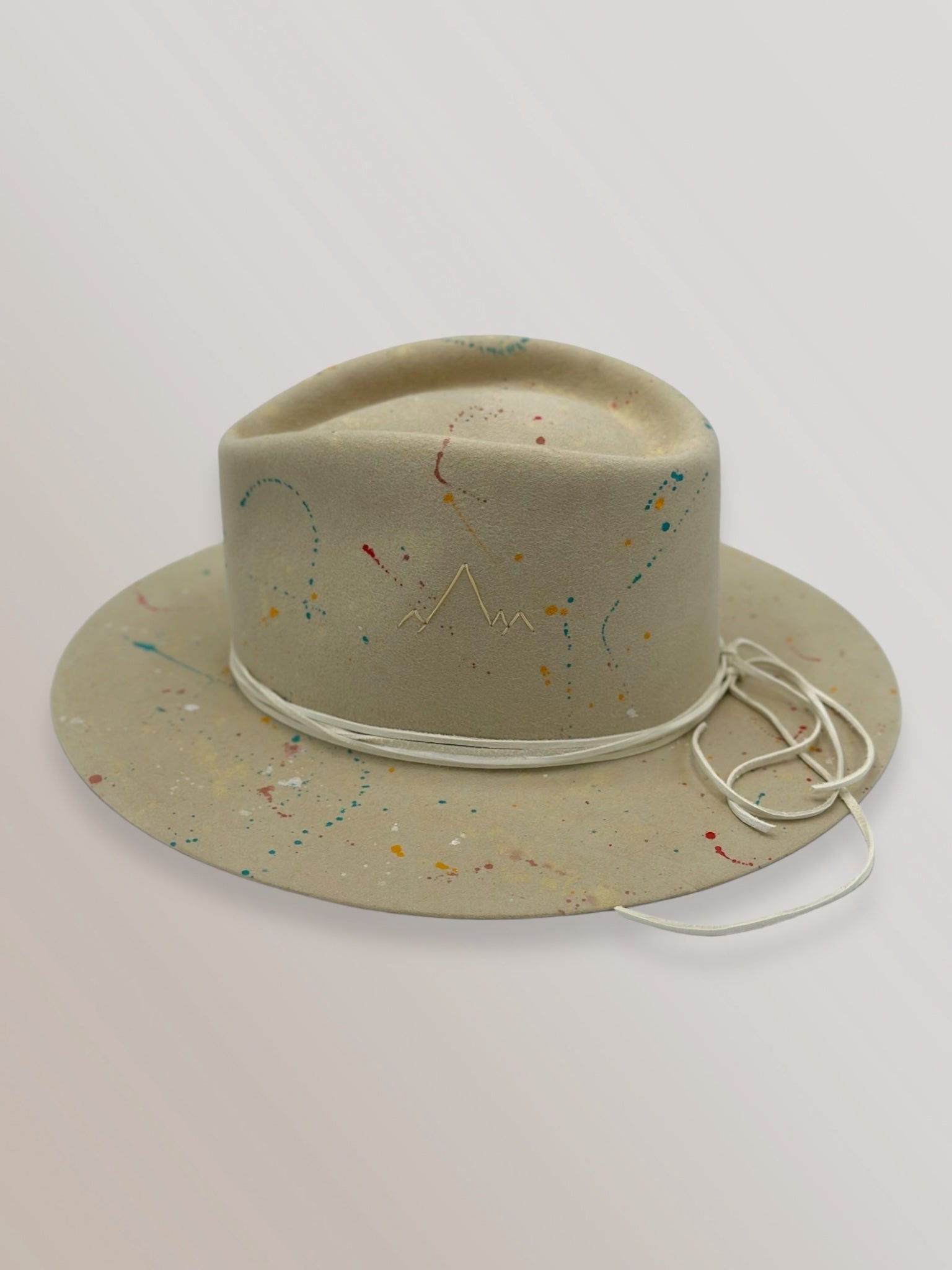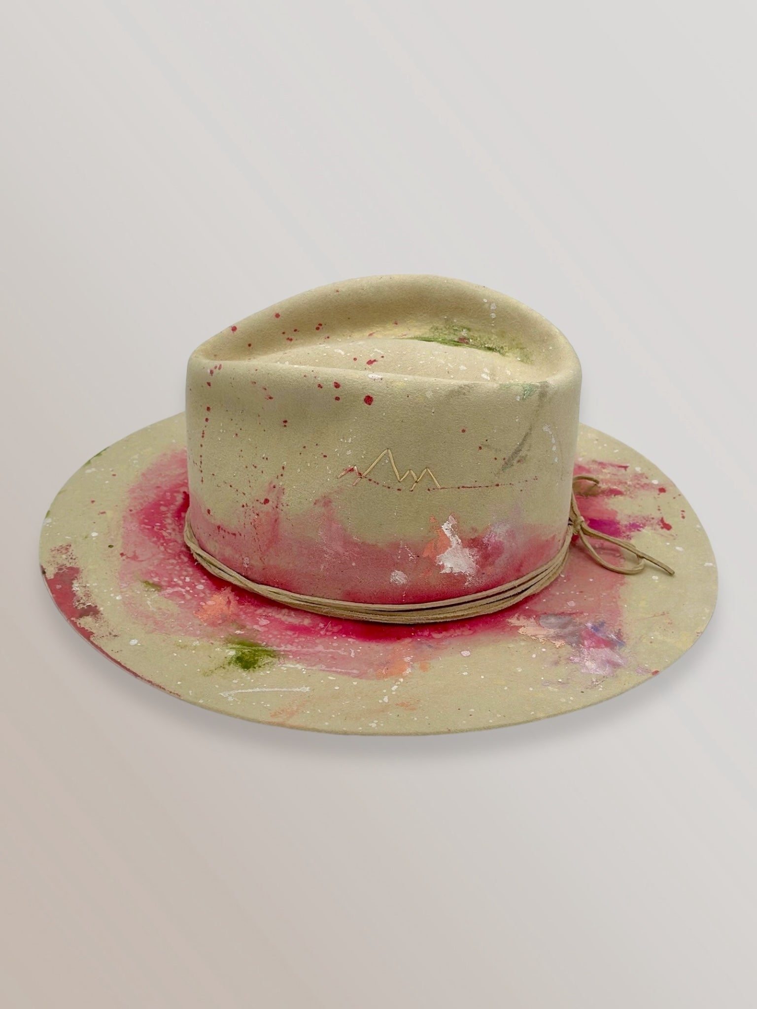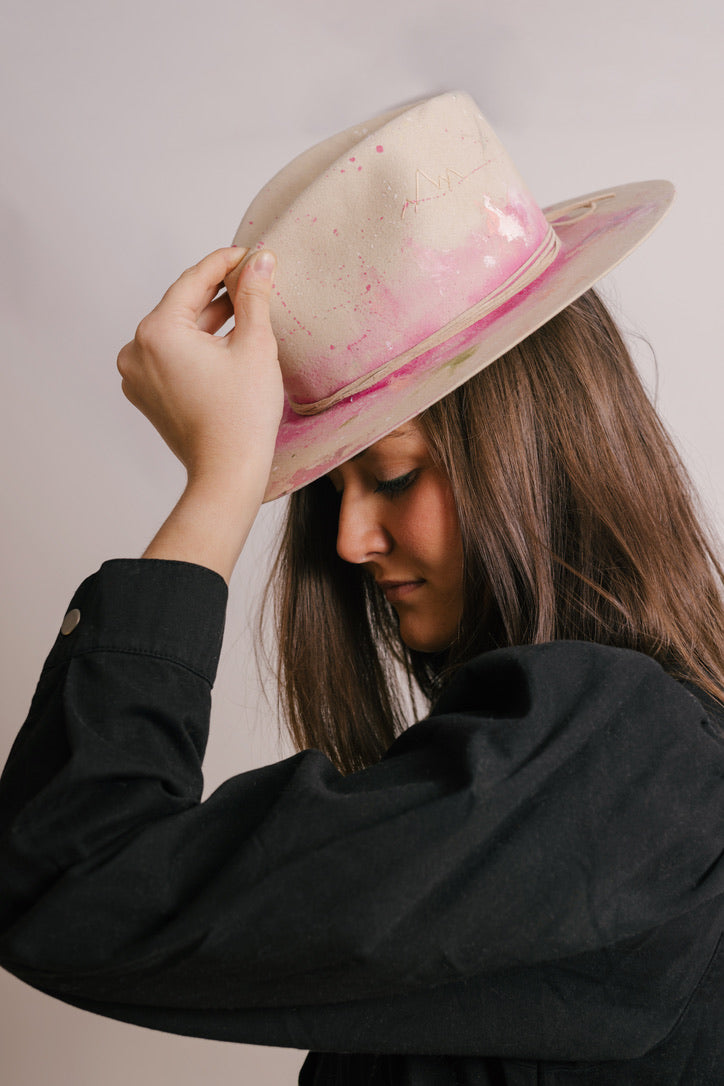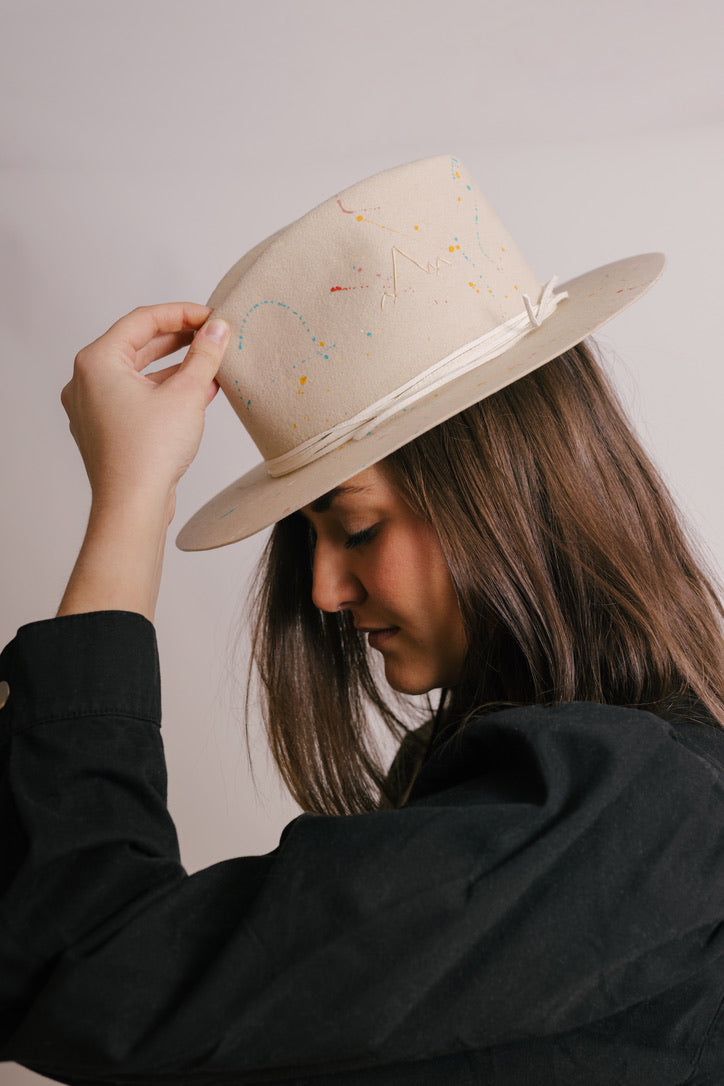 Custom painted and designed by mixed media artist, Lauren Liberg, these dress weight hat was hand painted with acrylics, bleach and dye. Teton Stitched detail with leather band.