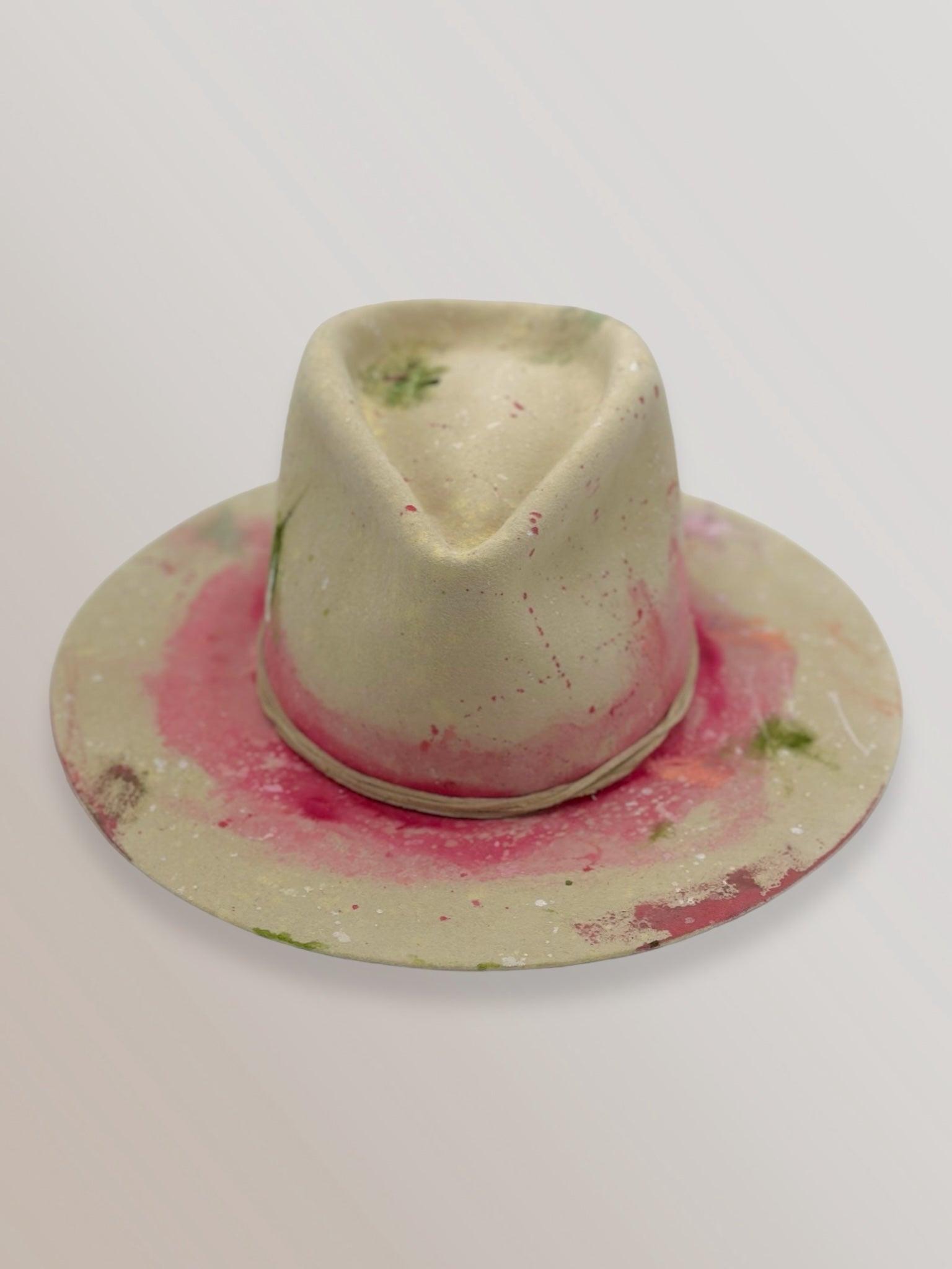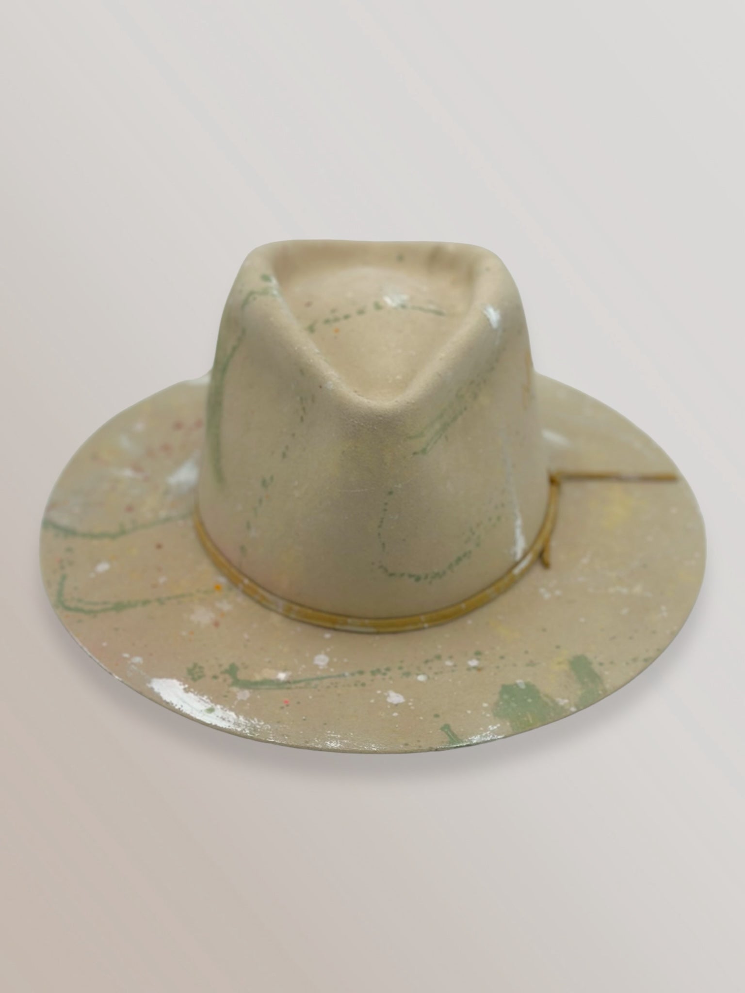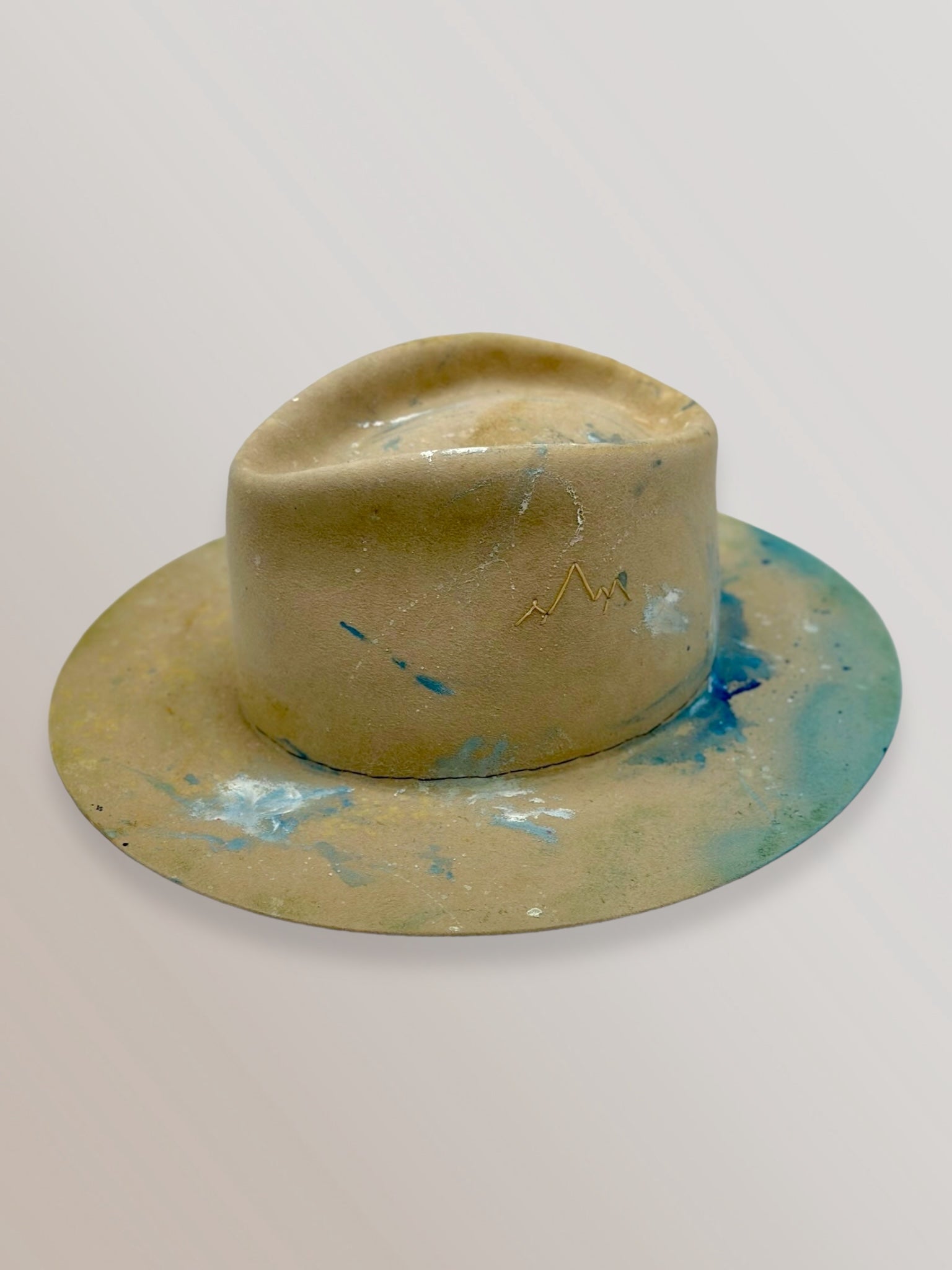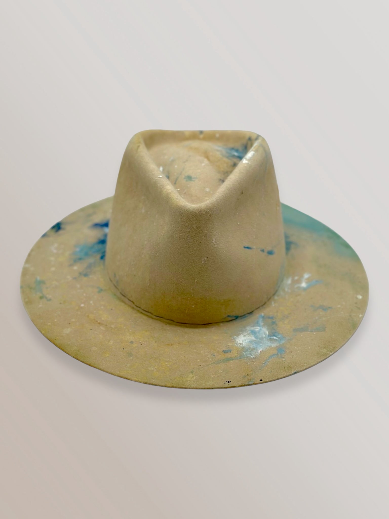 Custom painted and designed by mixed media artist, Lauren Liberg, these dress weight hat was hand painted with acrylics, bleach and dye. Teton Stitched detail with leather band.