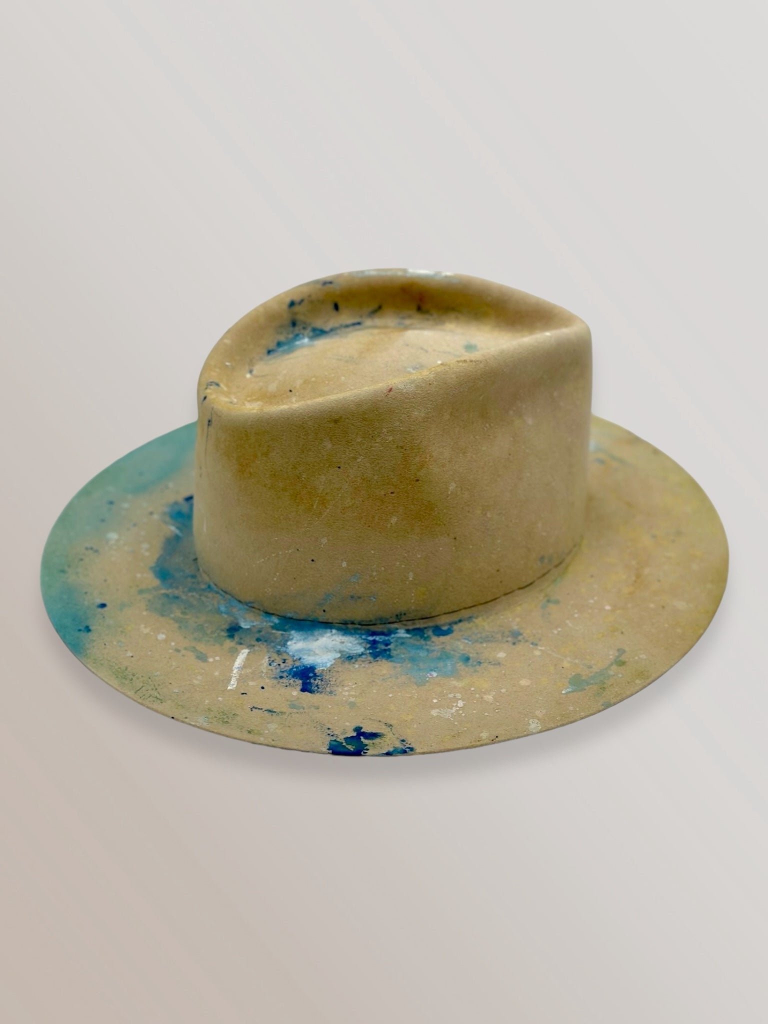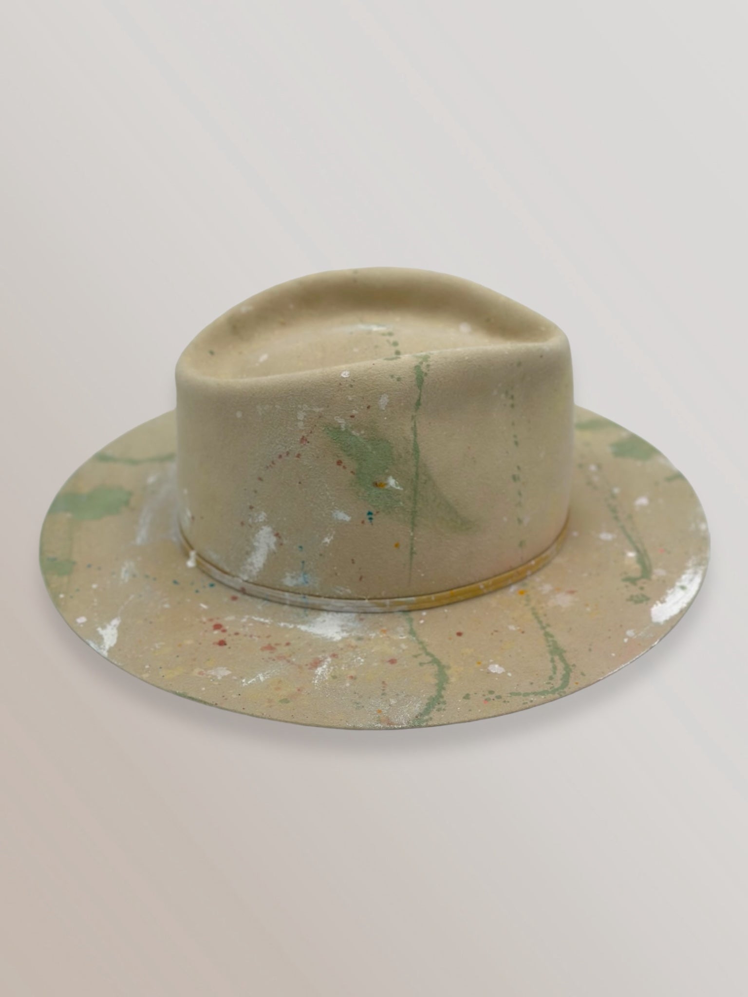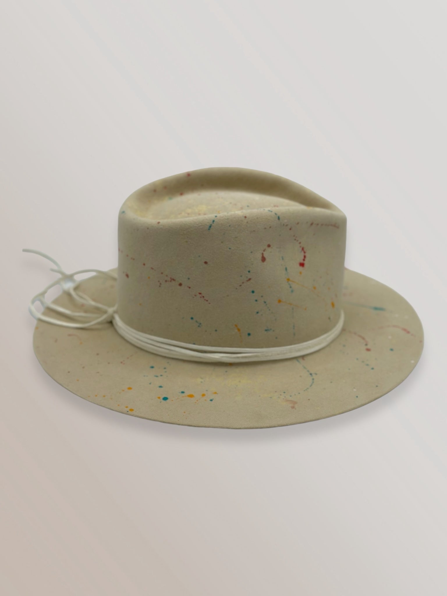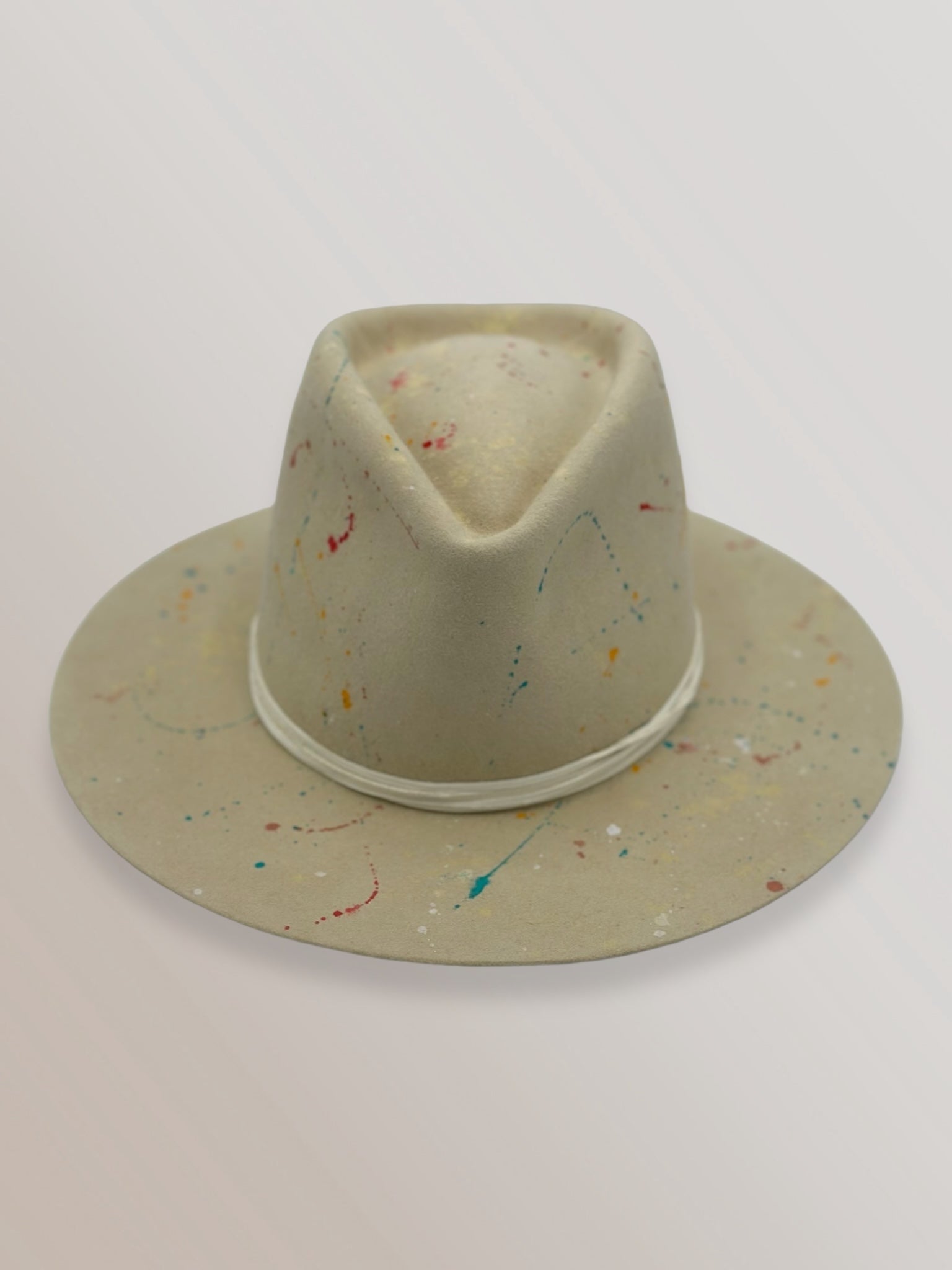 Custom painted and designed by mixed media artist, Lauren Liberg, these dress weight hat was hand painted with acrylics, bleach and dye. Teton Stitched detail with leather band.