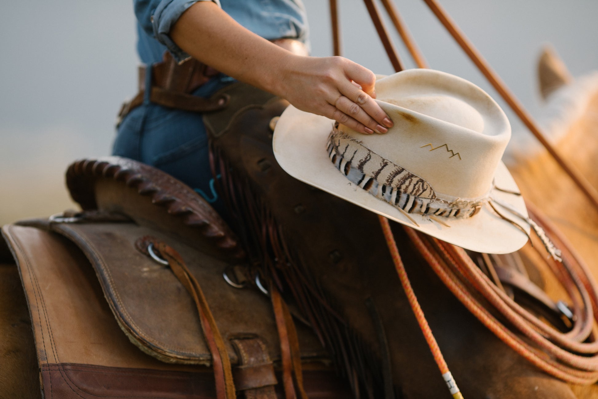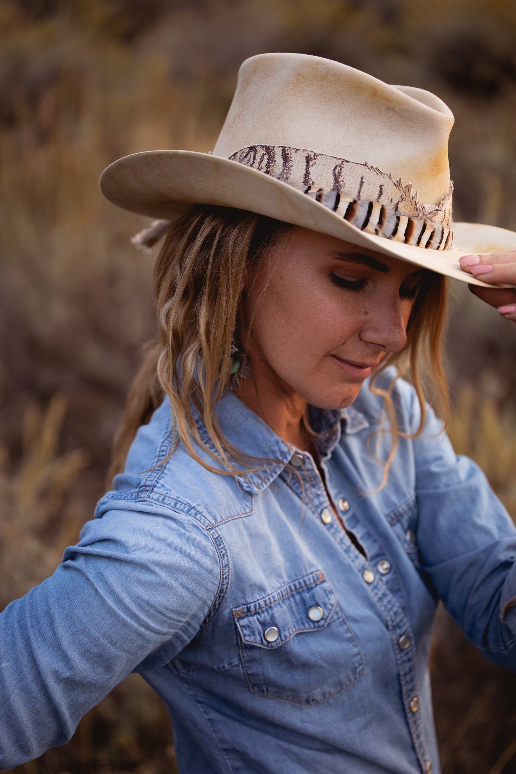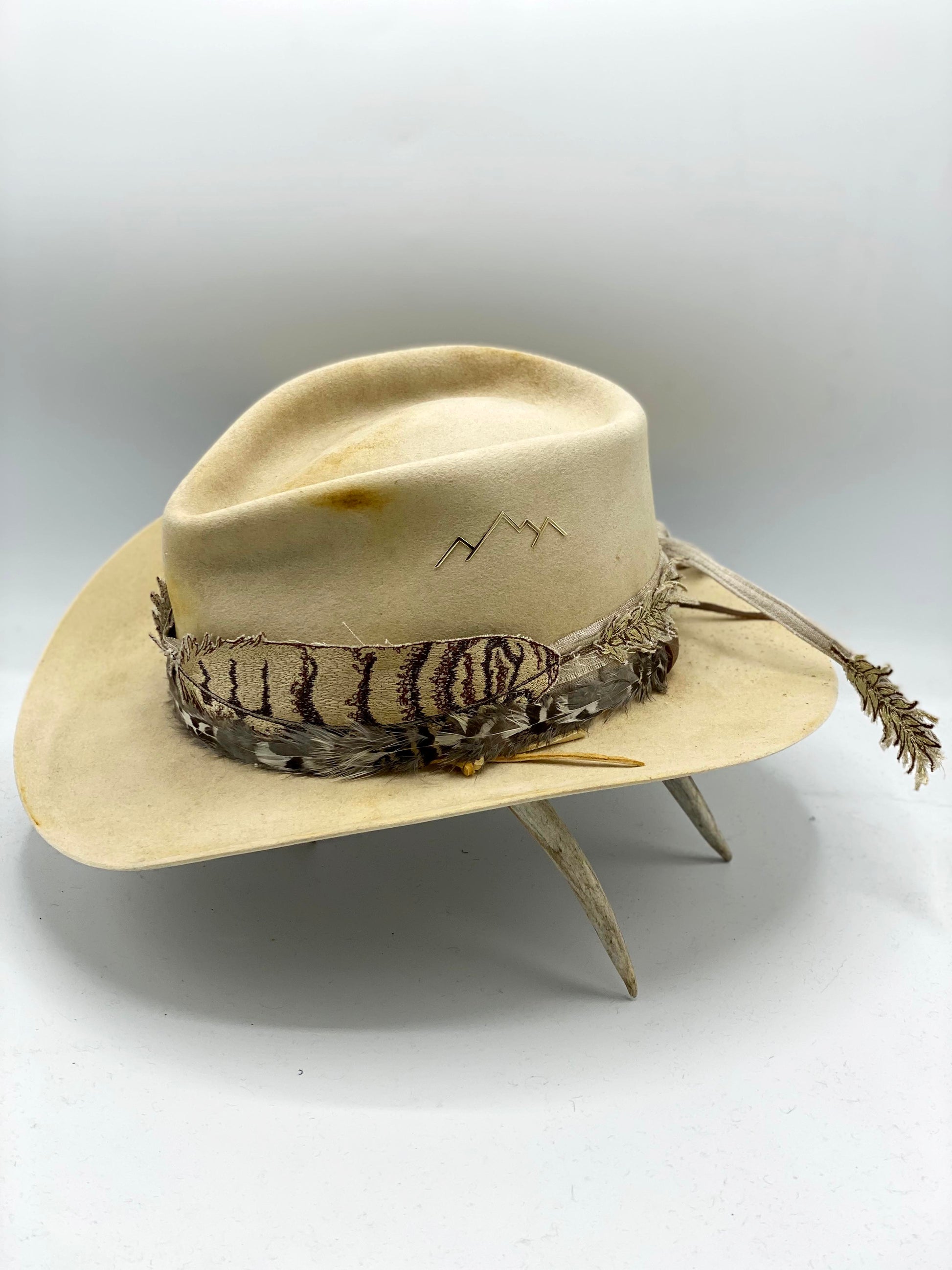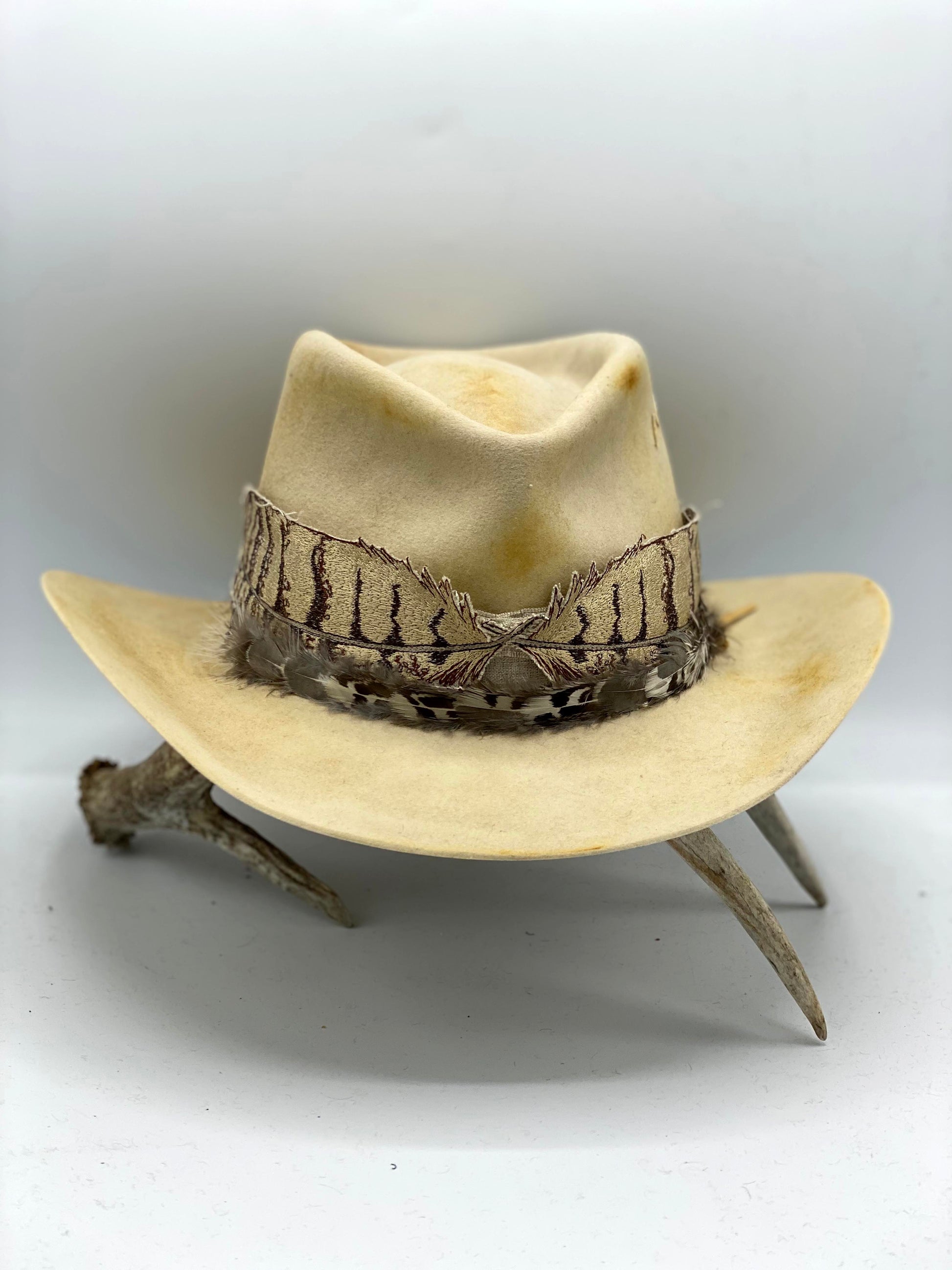 Embroidered band pictured on distressed western bone hat with feather band and white gold mountain pin accessories. All sold separately.