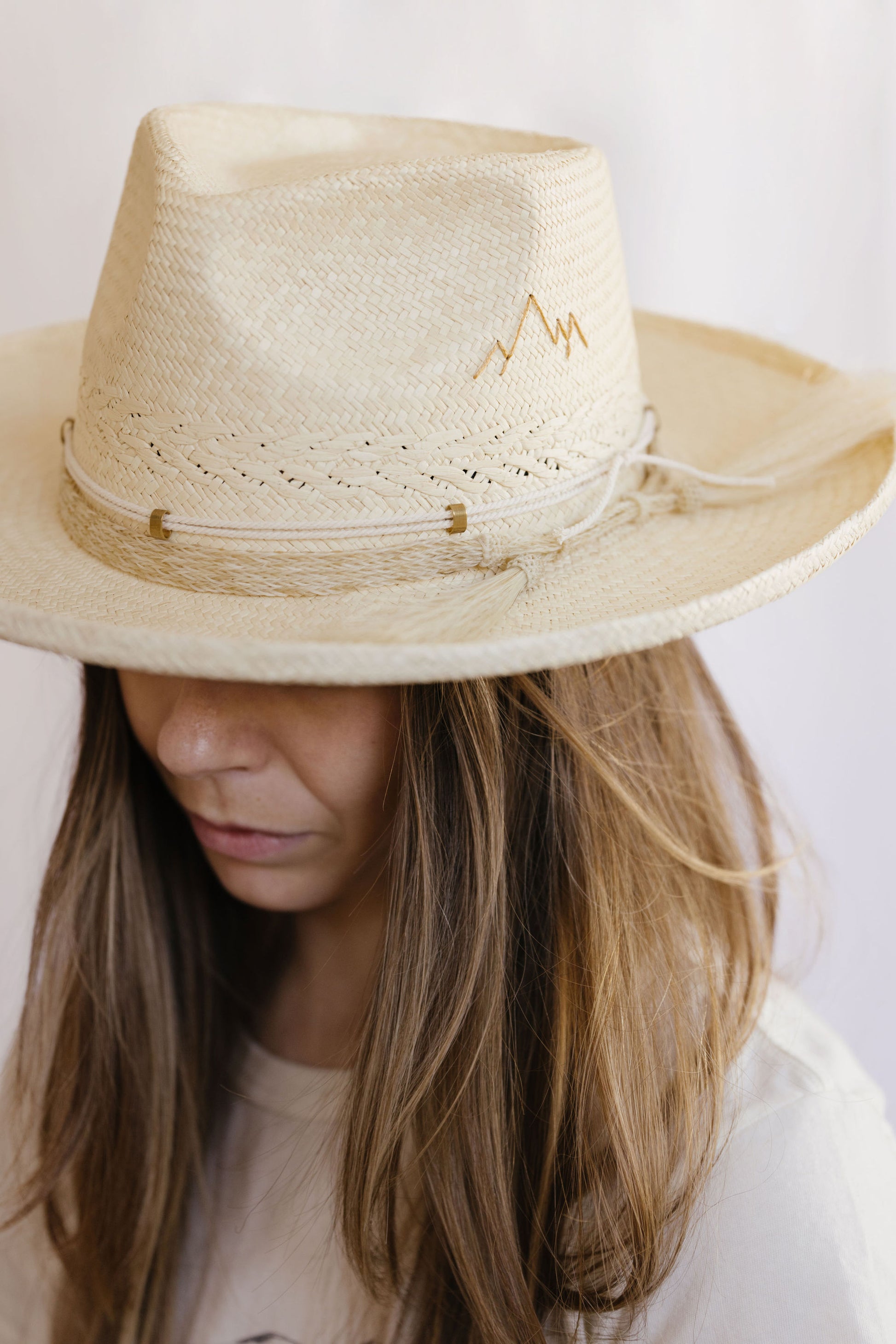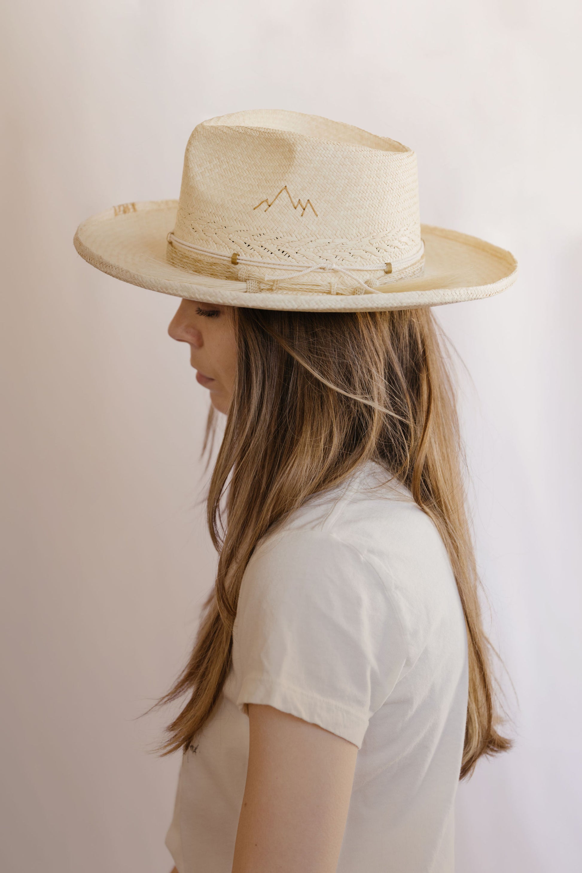 Hand embroidered mountain detail on crown