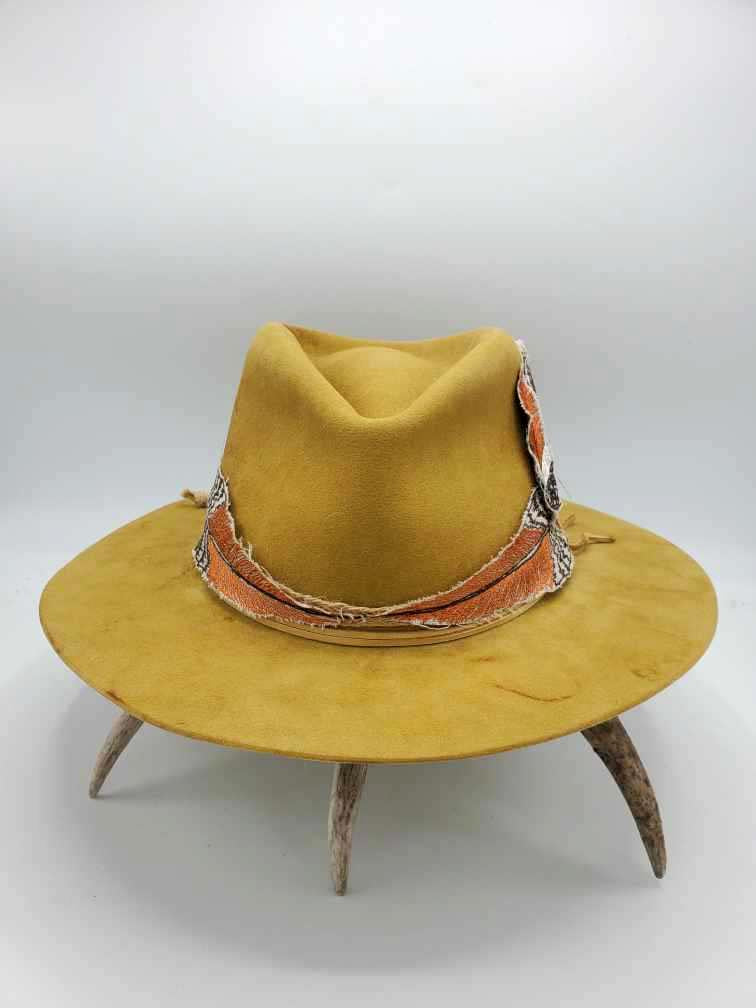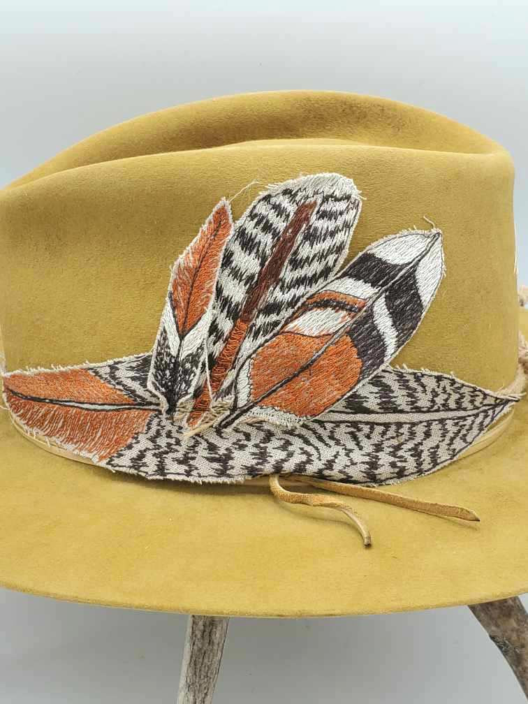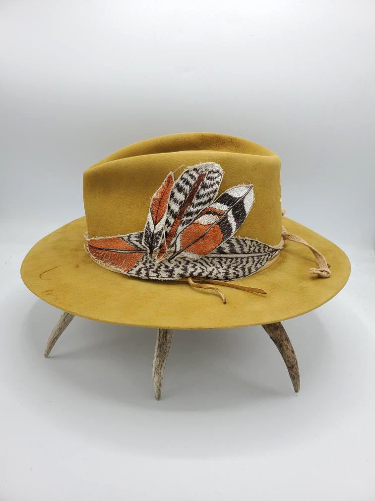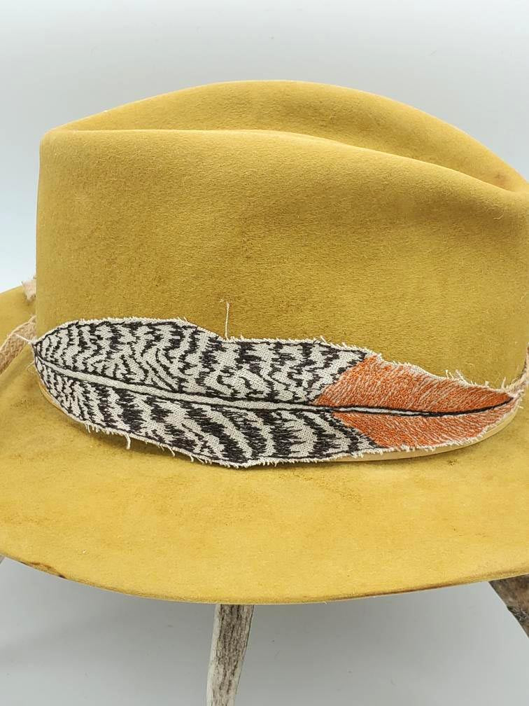 Embroidered band shown on western gold hat with distressing. Hat sold separately.