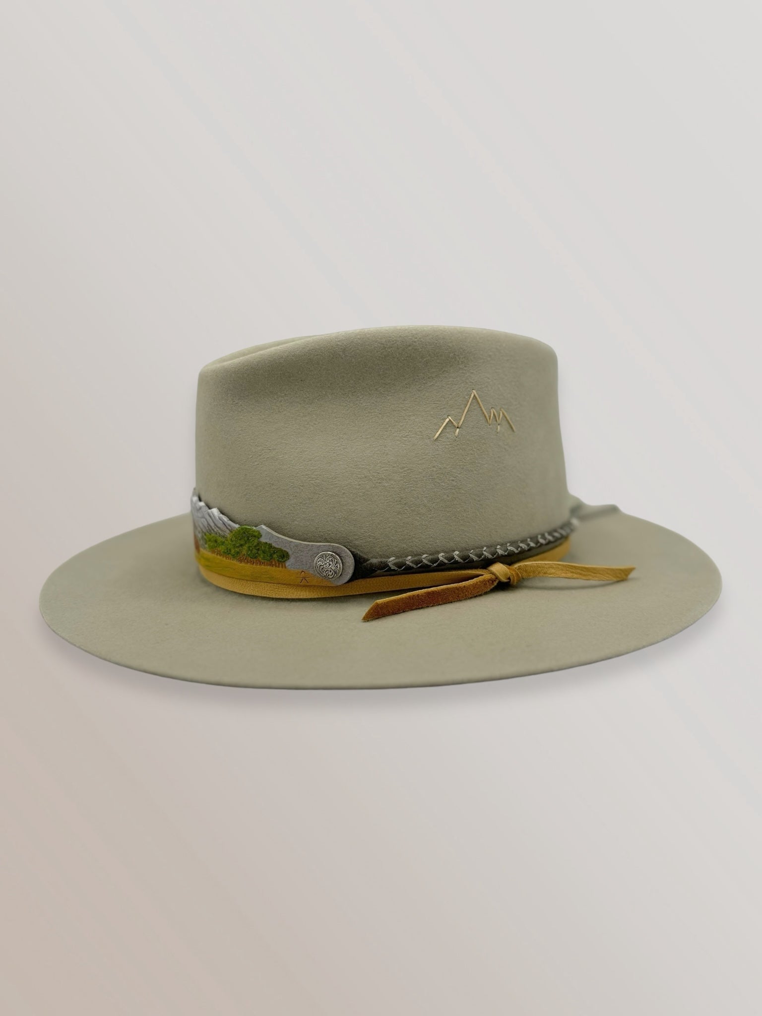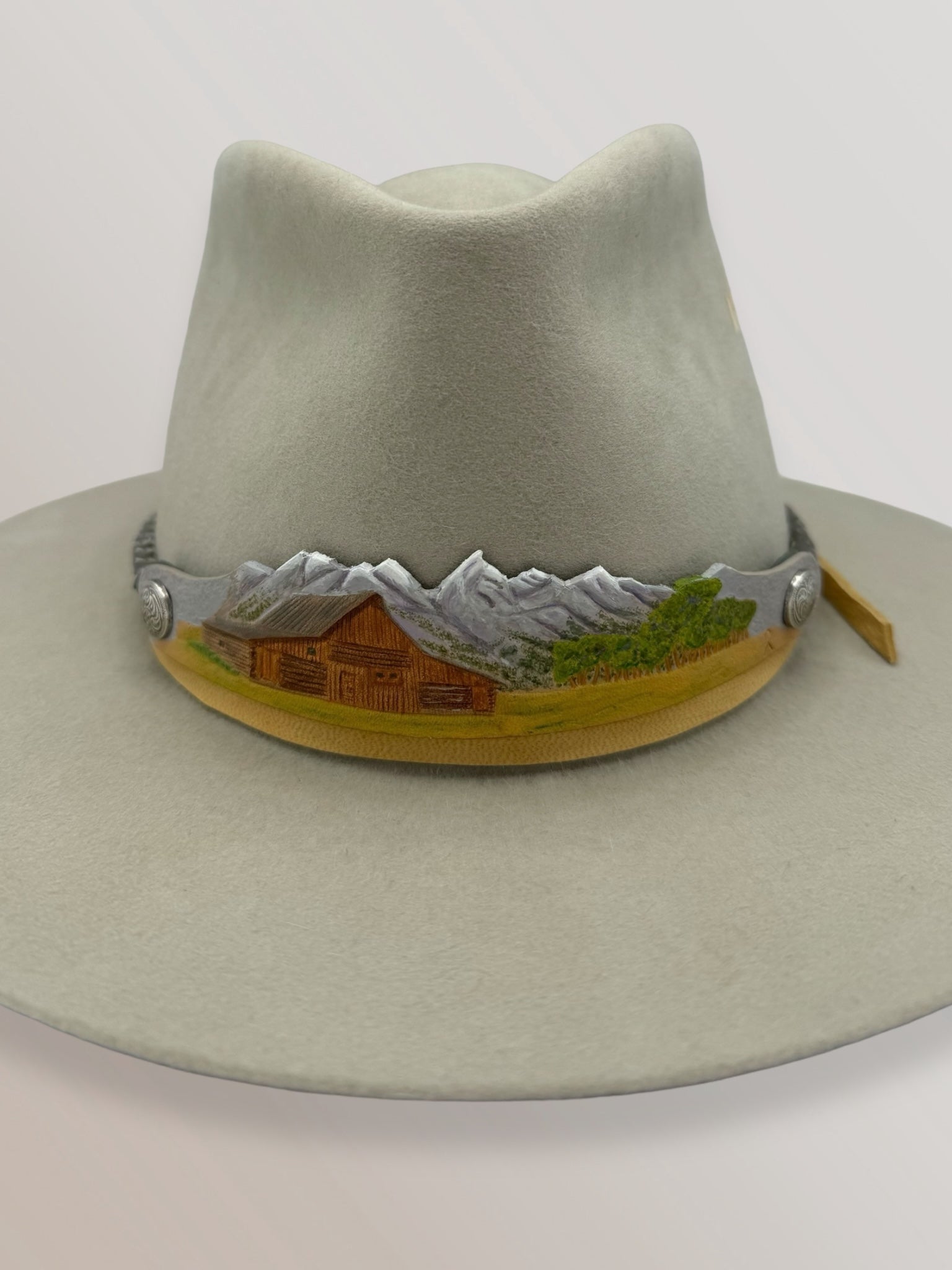 Hand carved and painted leather band with 1/2" conches, light gray round beaded leather with antler beads for adjusting.