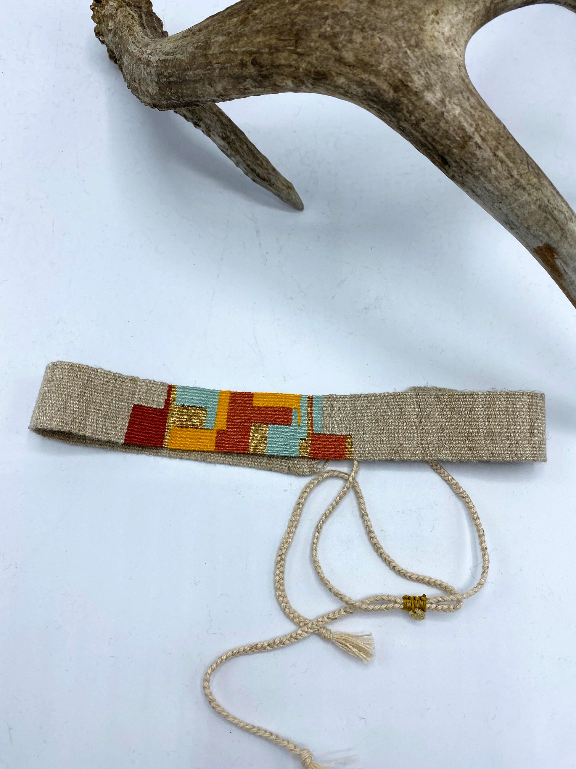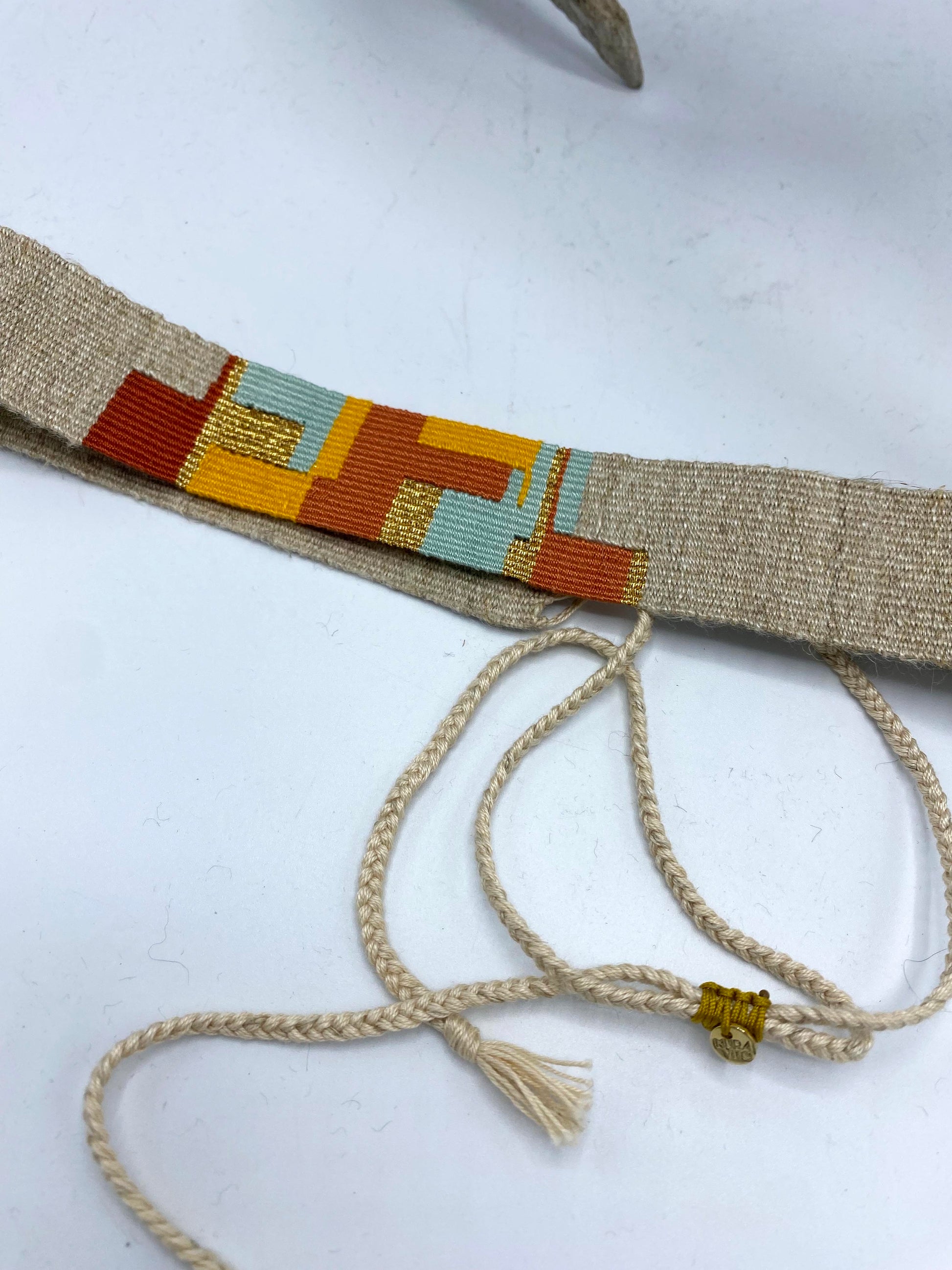 Unique hand-woven textile hat band made of the finest threads and yarns such as 100% Egyptian cotton, silk, hemp and Japanese metallic threads.