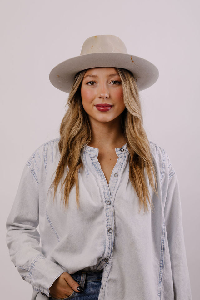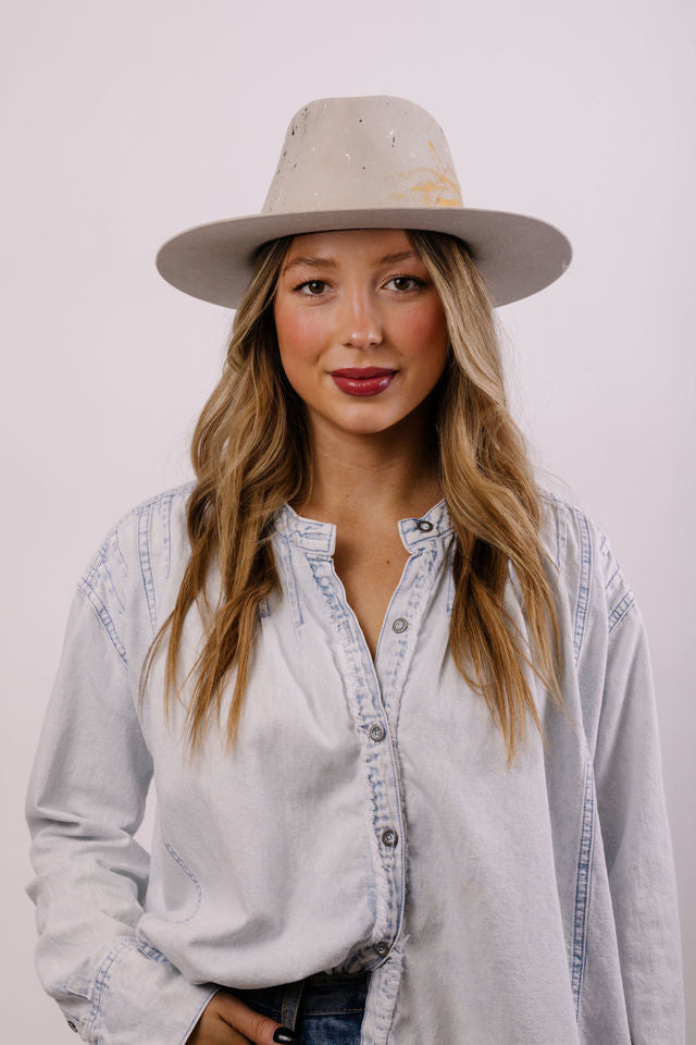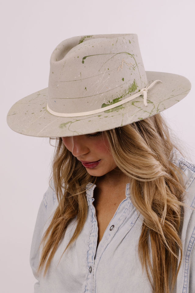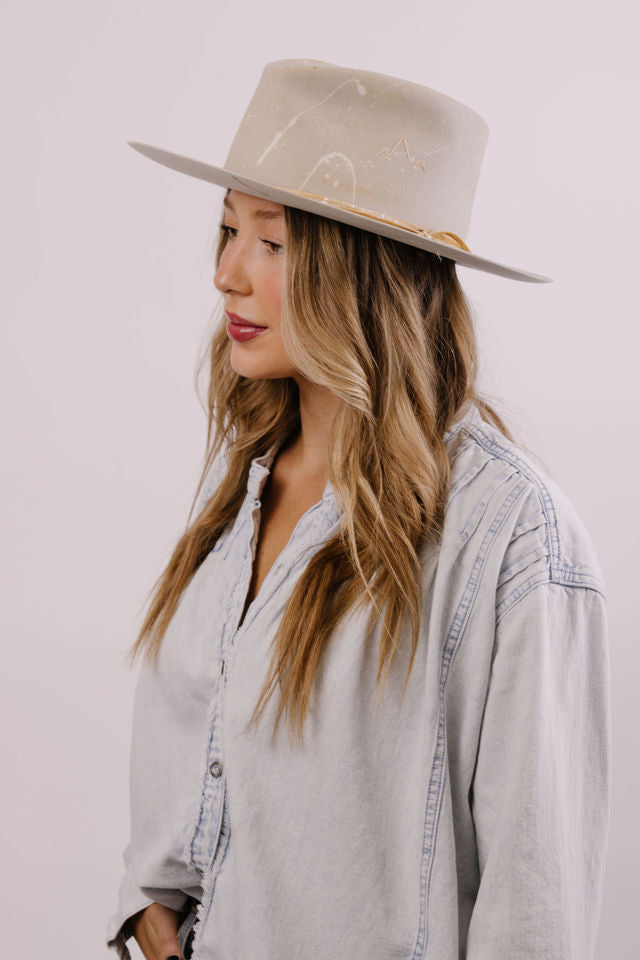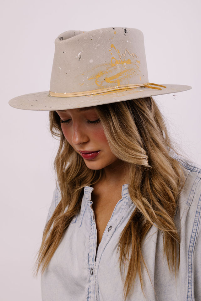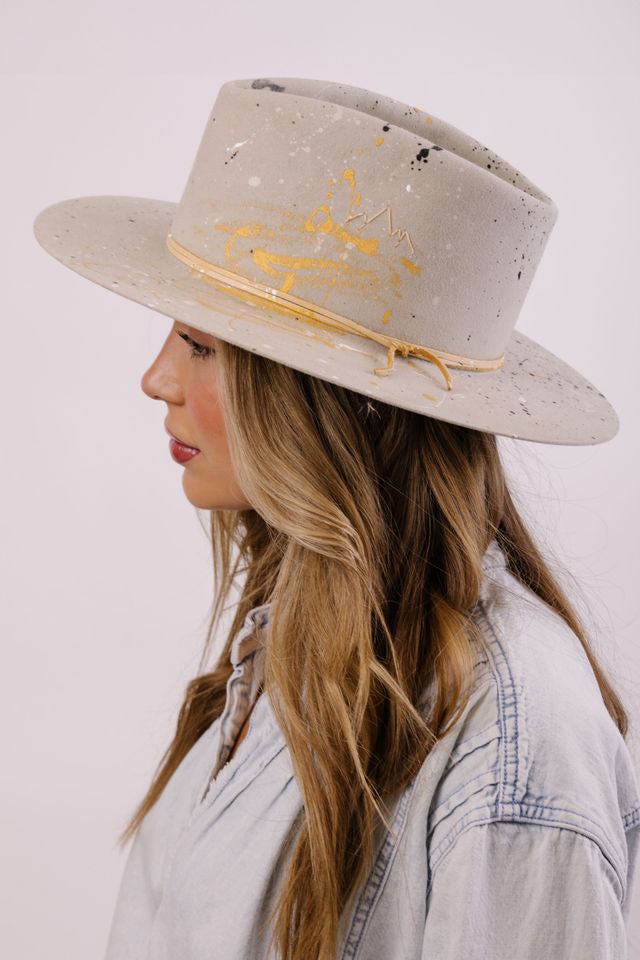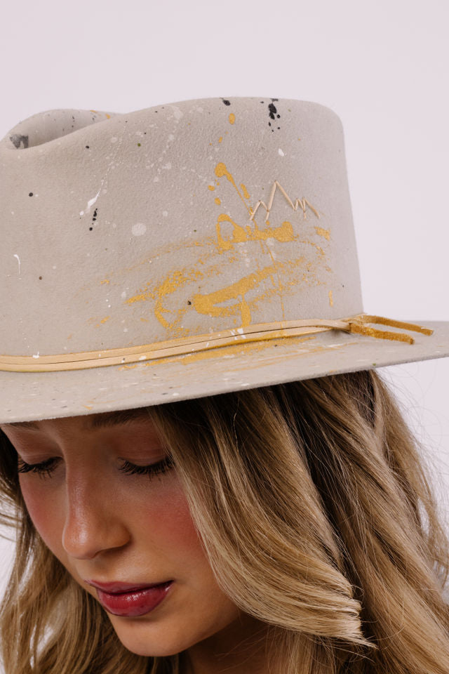 Custom painted and designed by mixed media artist, Lauren Liberg, these dress weight hats were hand painted with acrylics and dye. Teton Stitched detail with leather detail.