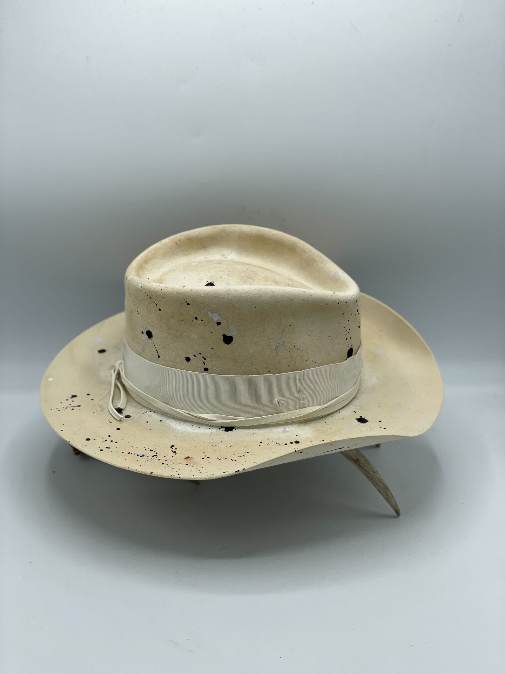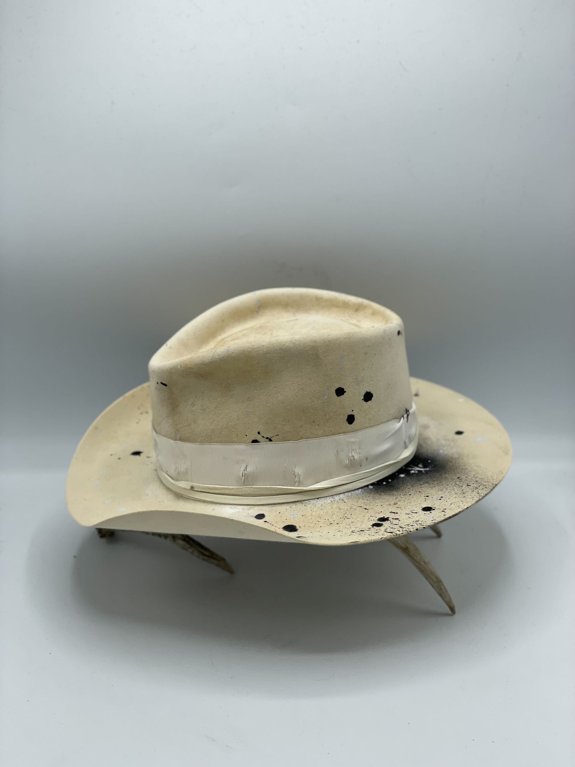 Custom painted and designed by mixed media artist, Lauren Liberg, this western weight hat was hand painted with acrylics, bleach and dye. Vintage ribbon and white leather detail.